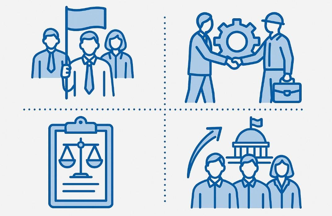 المفاوضة الجماعية: تفاوض النقابة مع أصحاب العمل أو الحكومات بشأن الأجور وظروف العمل.